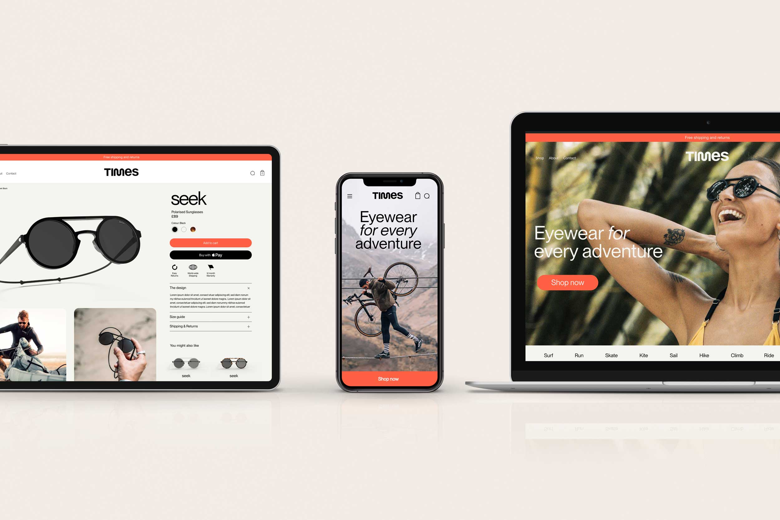 Times came to Bare Studio ready to make their mark. We developed a full brand identity — from tone of voice to visual direction. Capturing the confidence and clarity behind the product’s design. The identity extended into a custom Shopify website that feels as streamlined and durable as the sunglasses themselves.